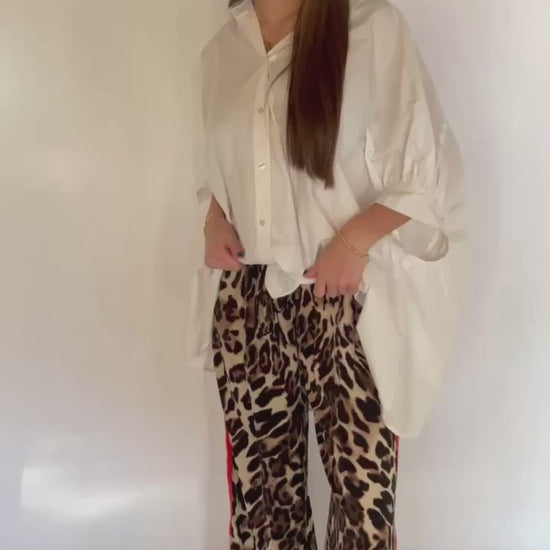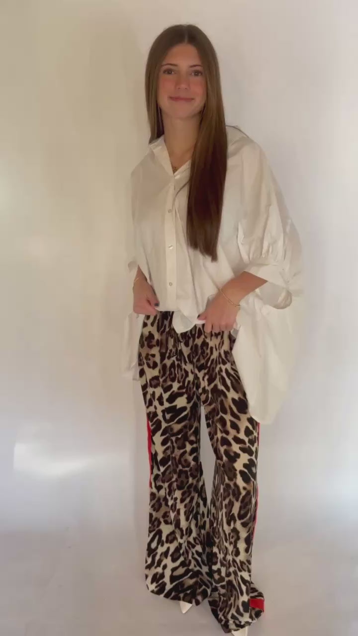 Our Lynn Leopard Track Pants are full length leopard pants with red stripes down the sides.